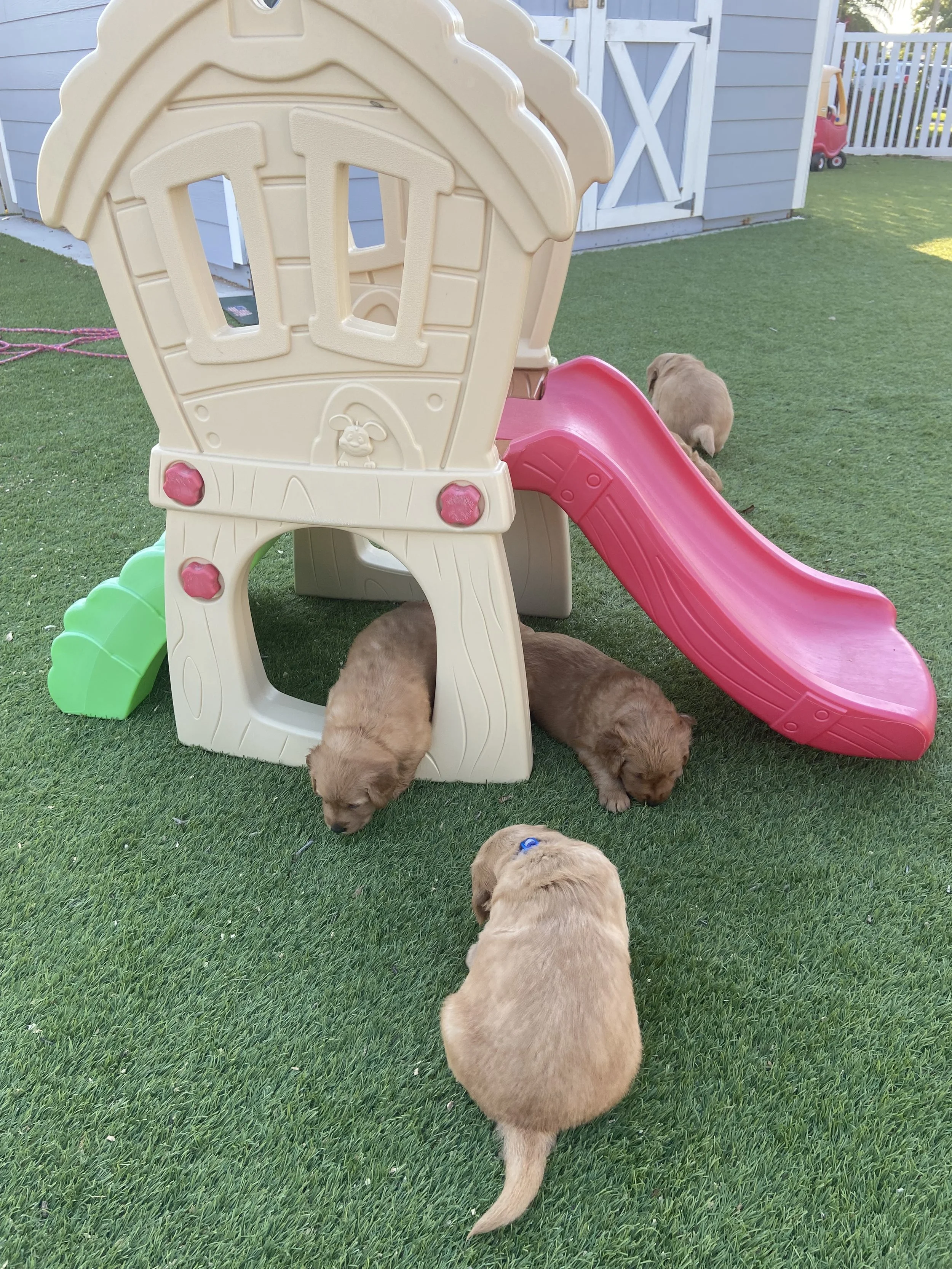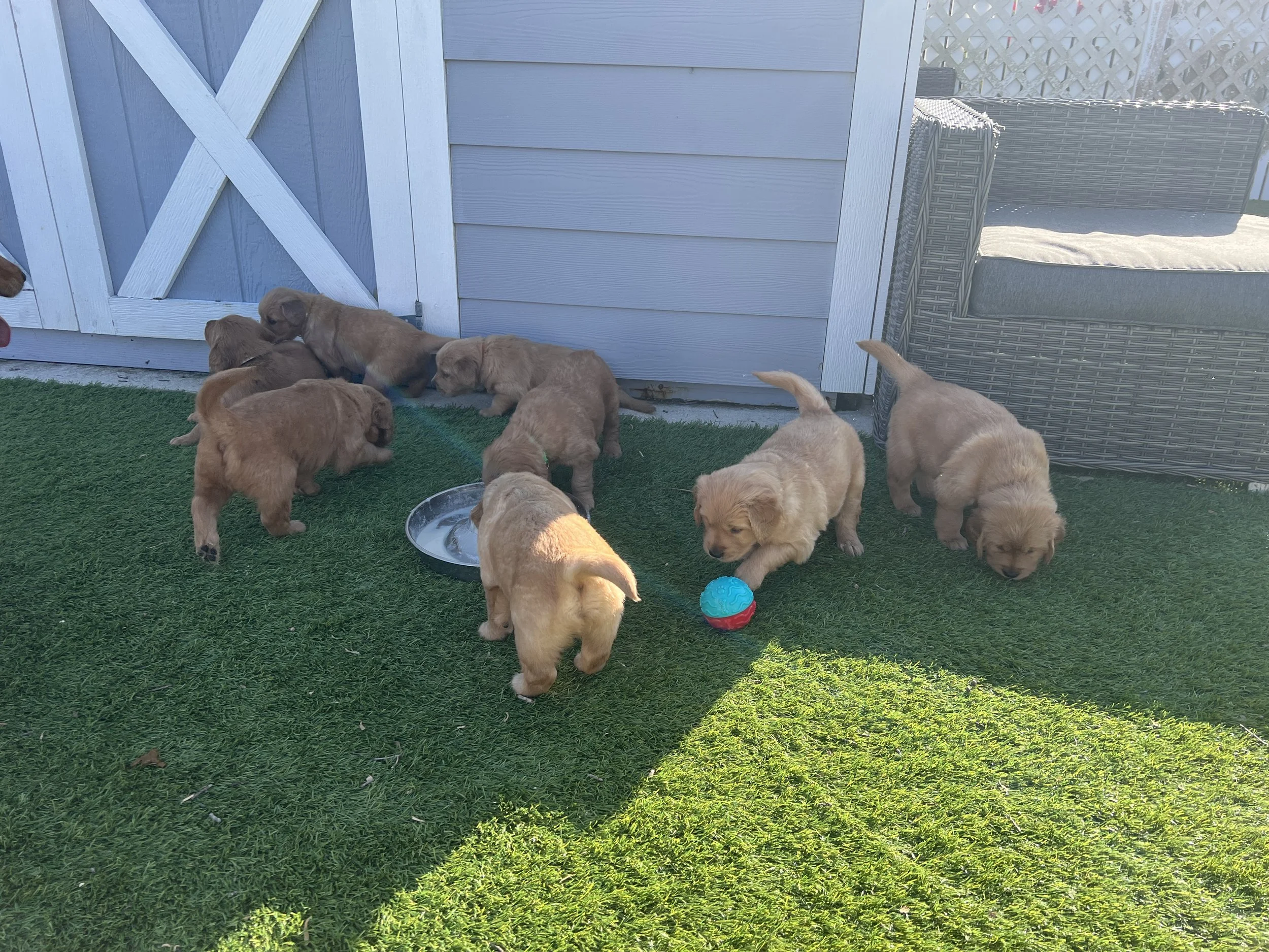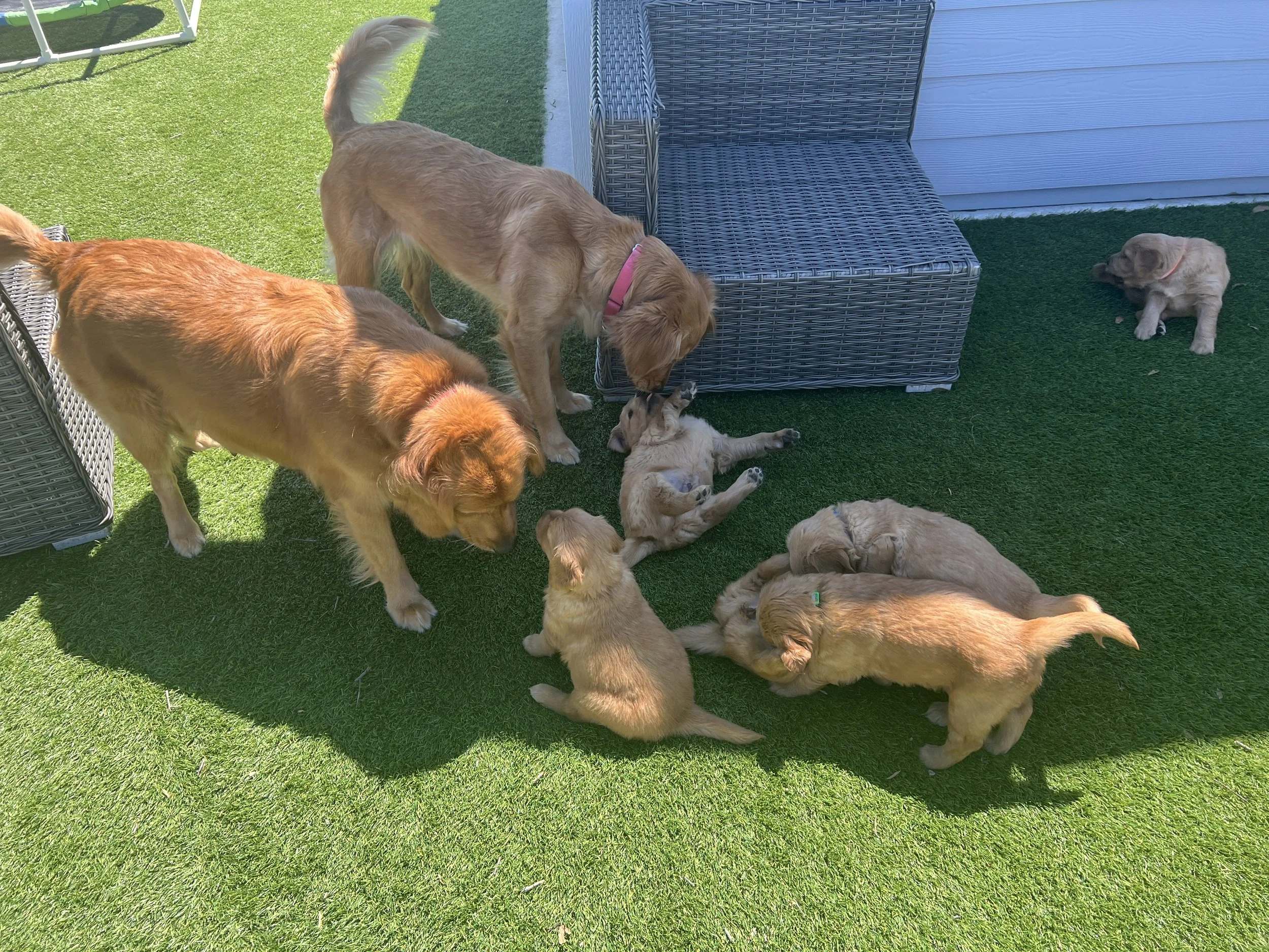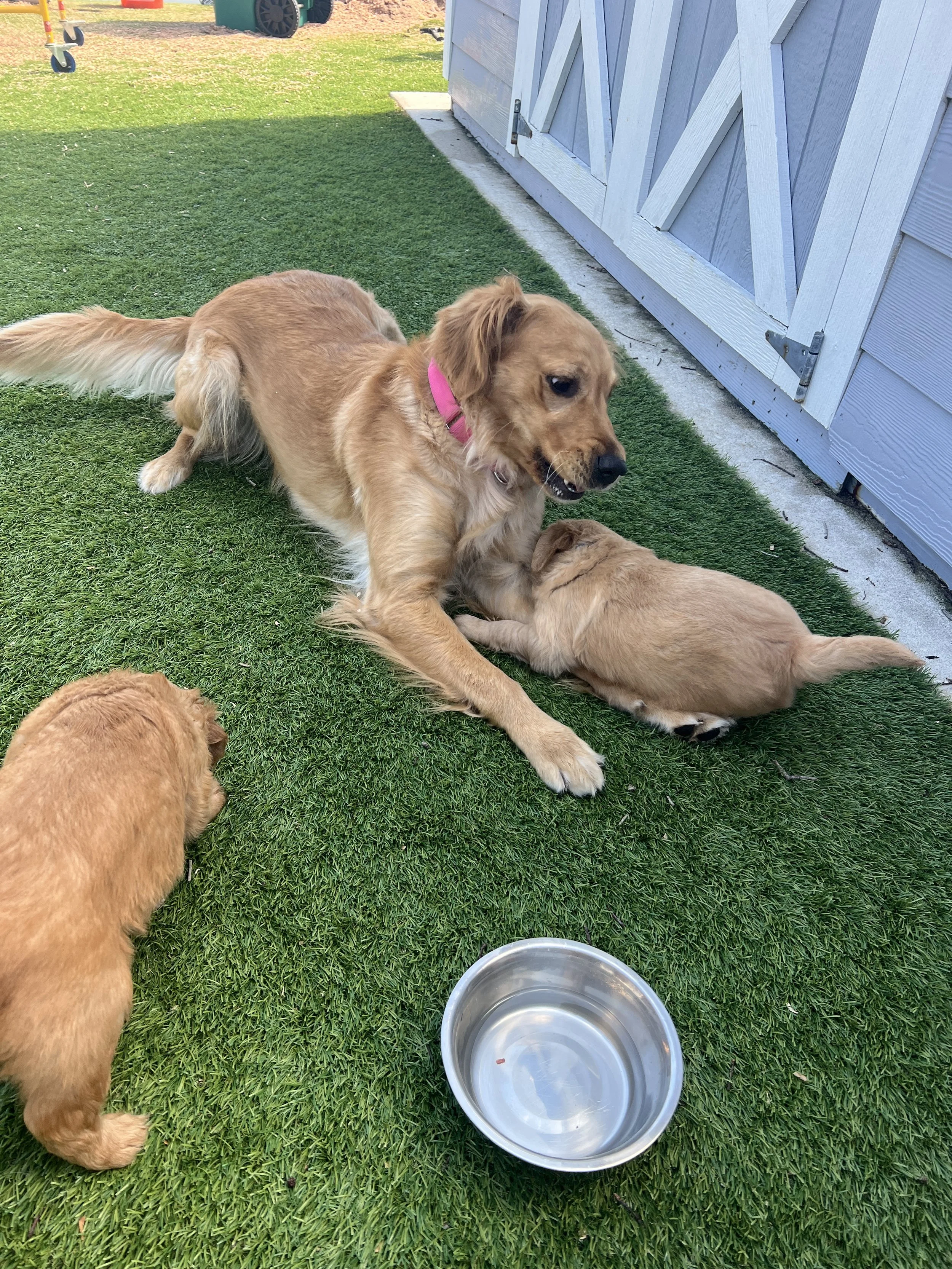 We are spending more time outside when the weather is good. The puppies are running, jumping, and tackling each other. They are loving playing with their big sister, Maggie.