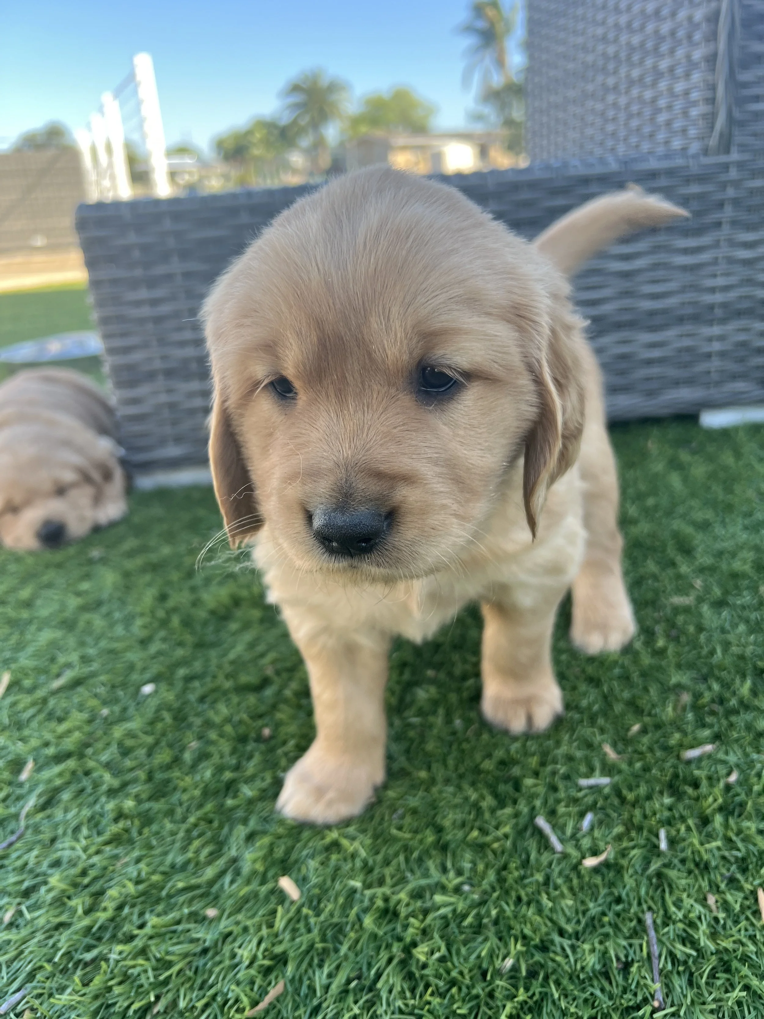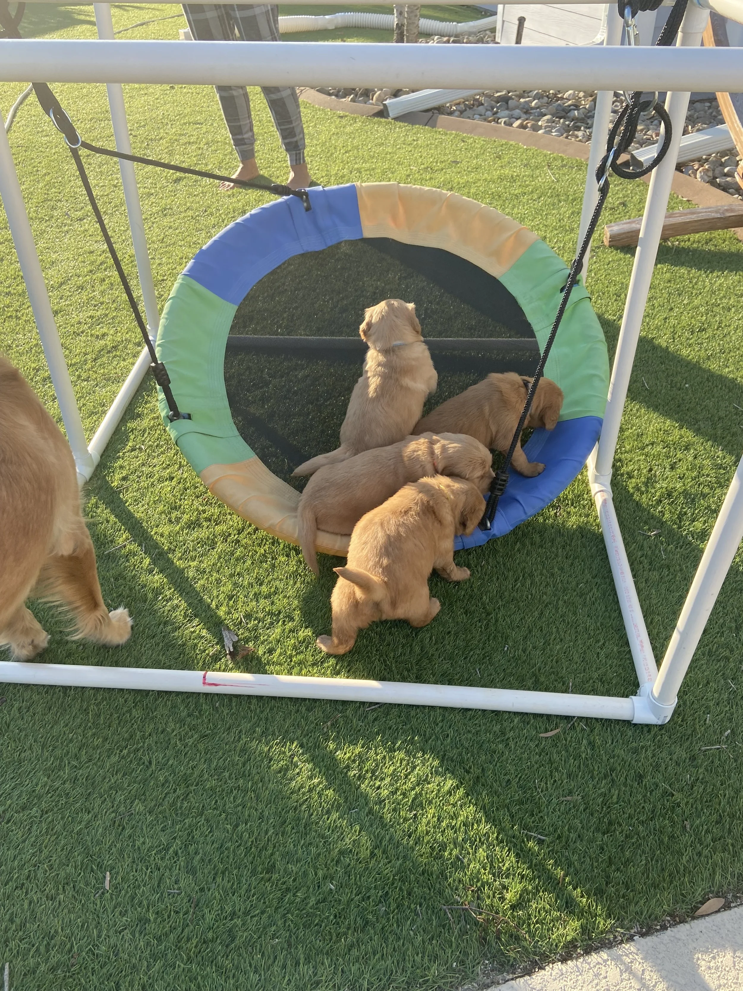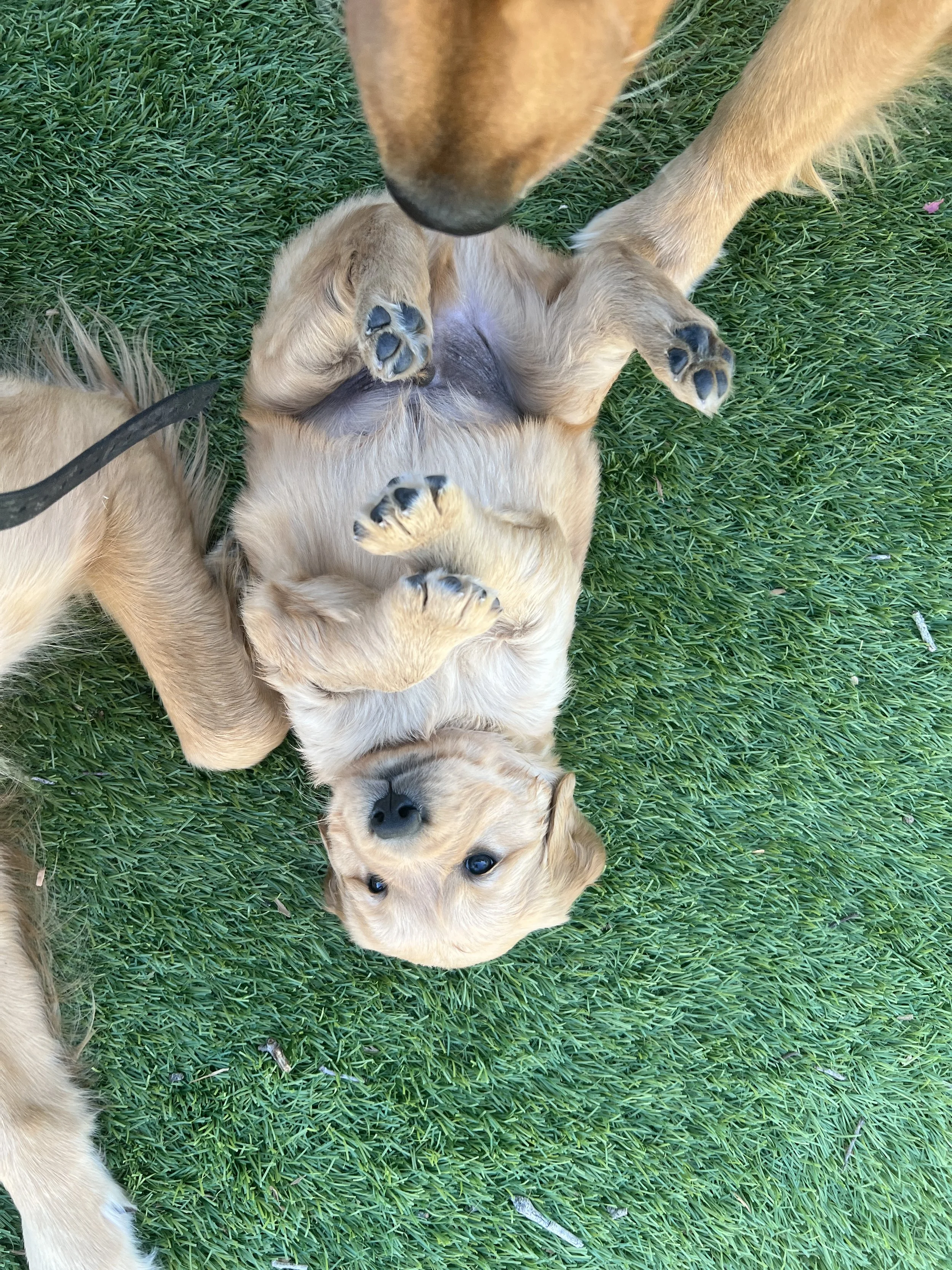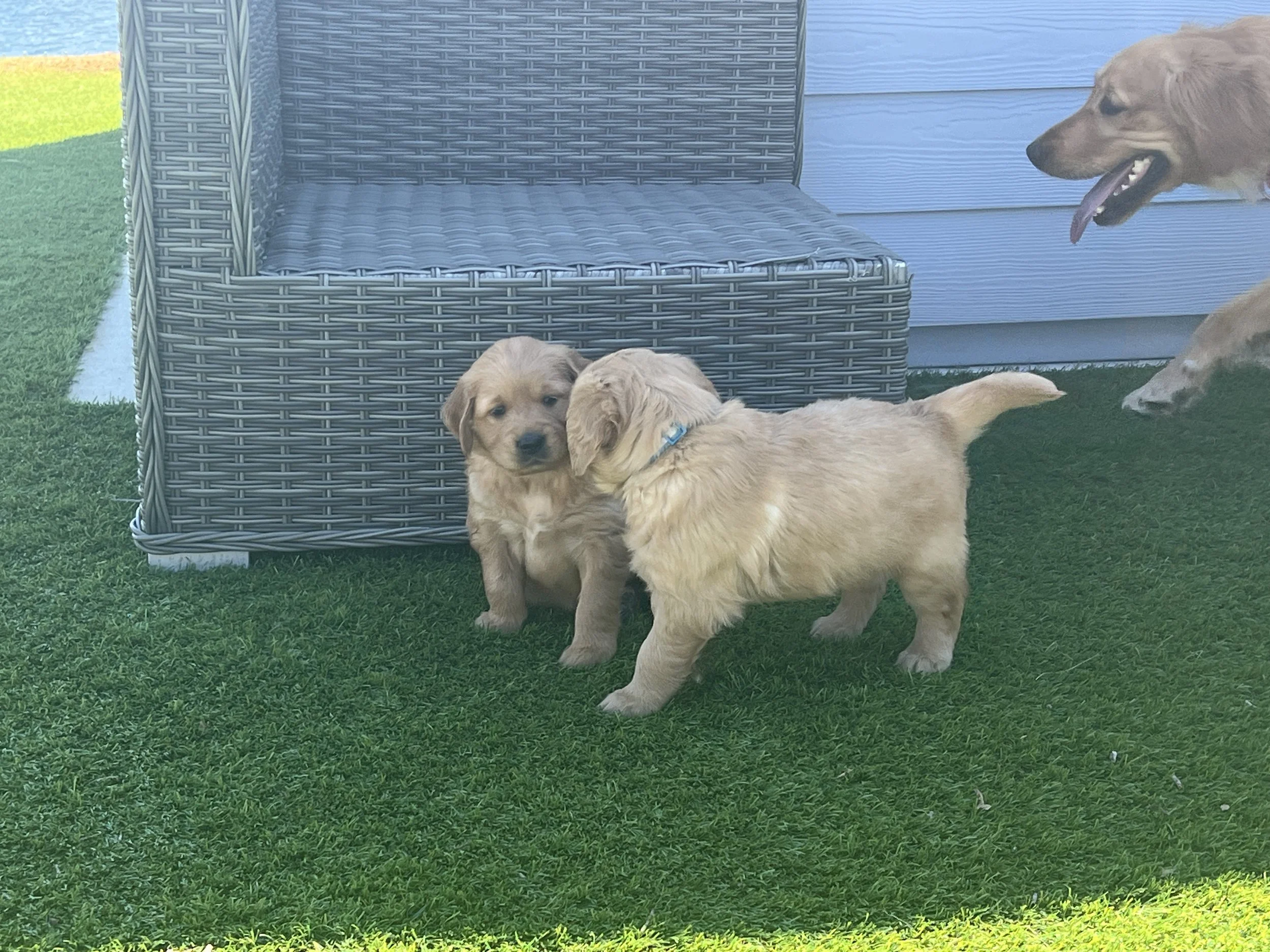 We are spending more time outside when the weather is good. The puppies are running, jumping, and tackling each other. They are loving playing with their big sister, Maggie.