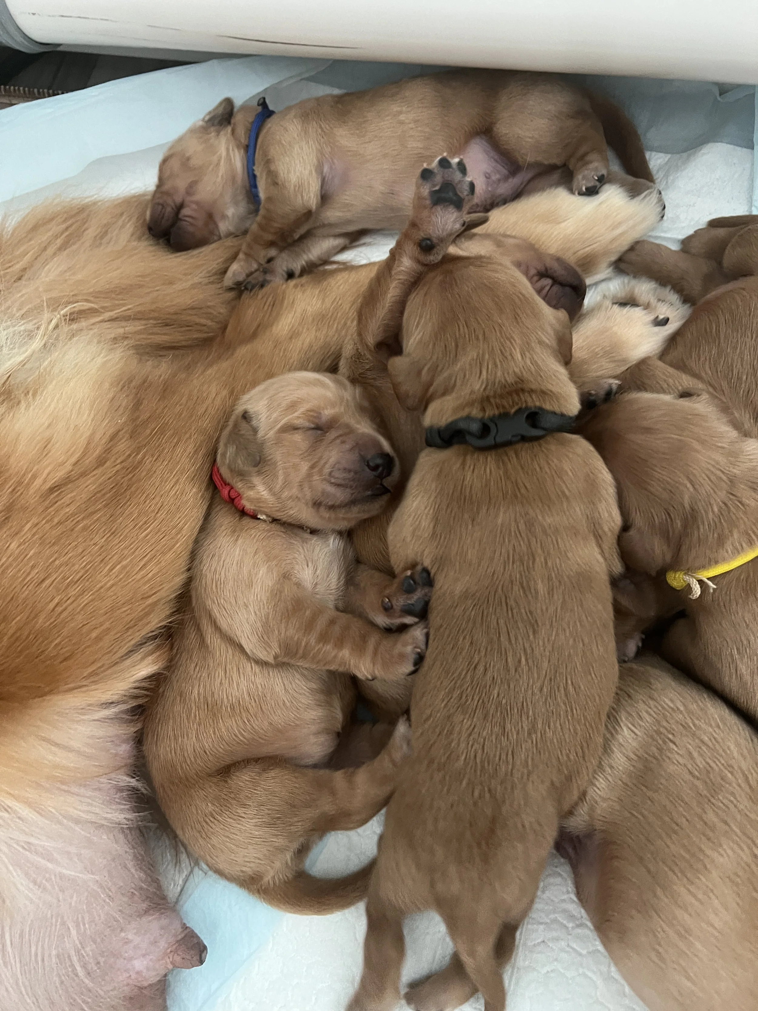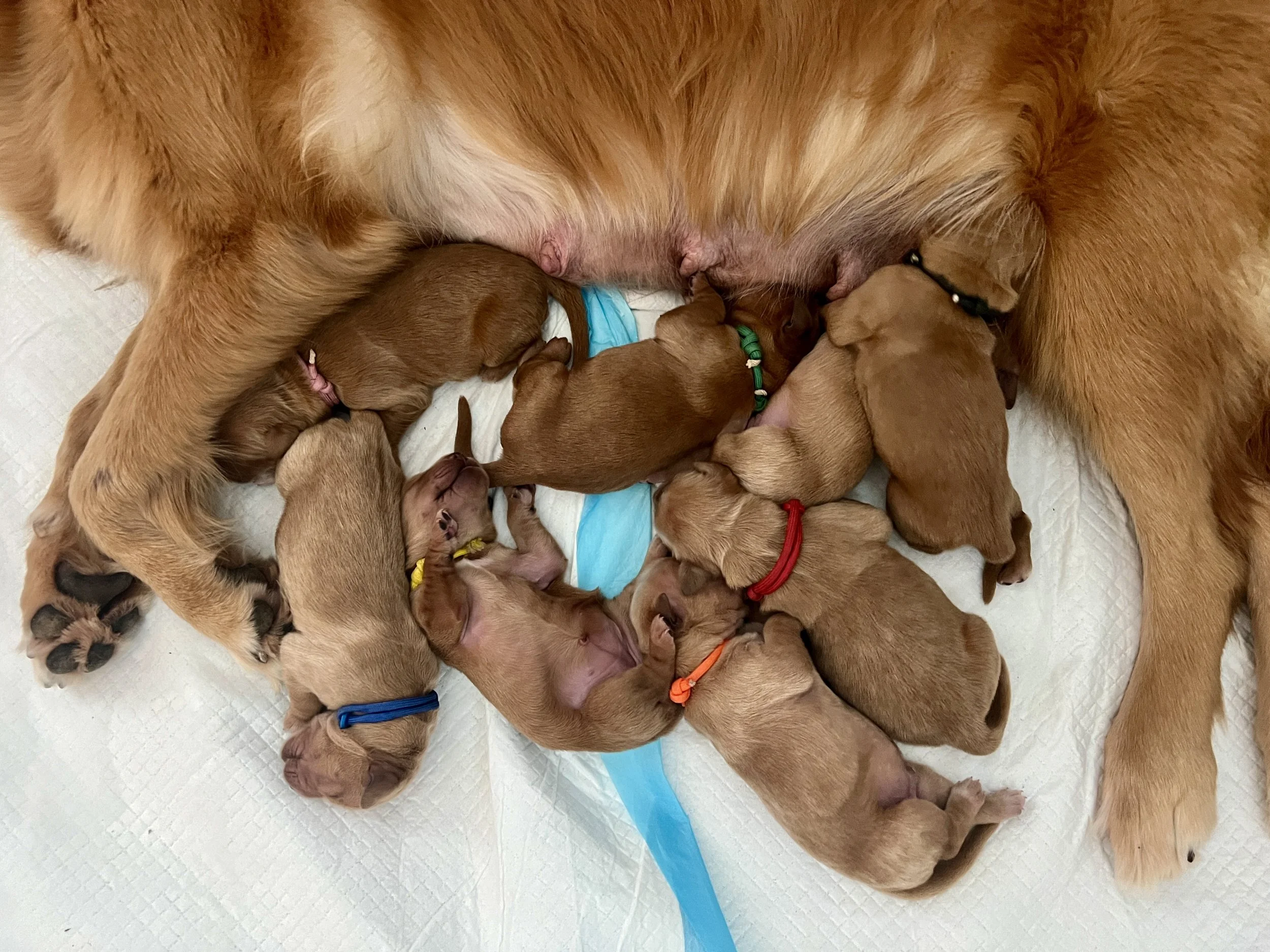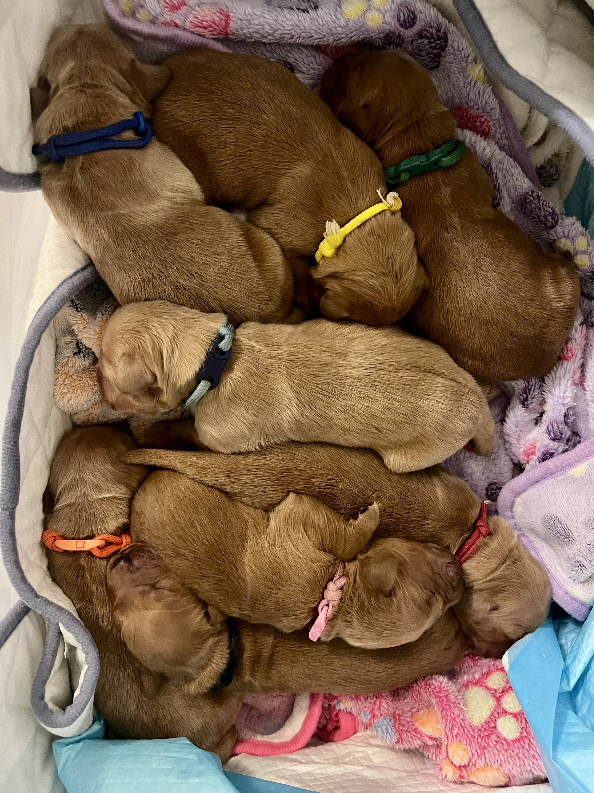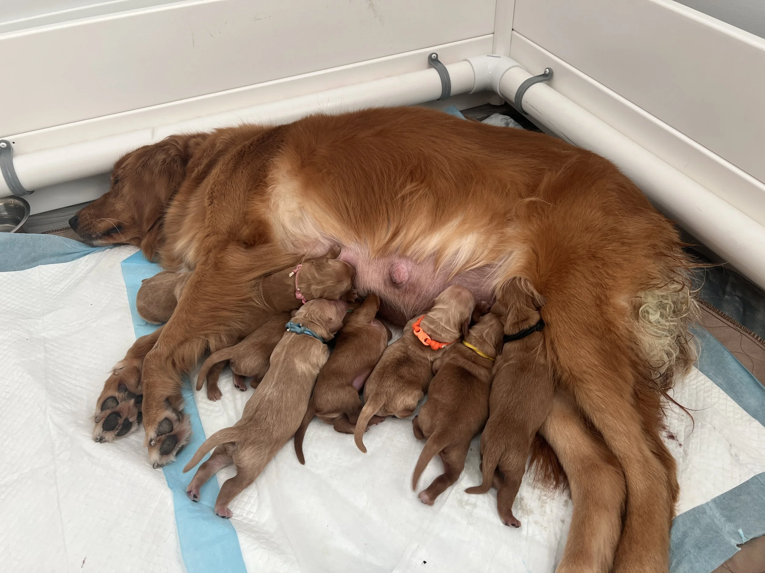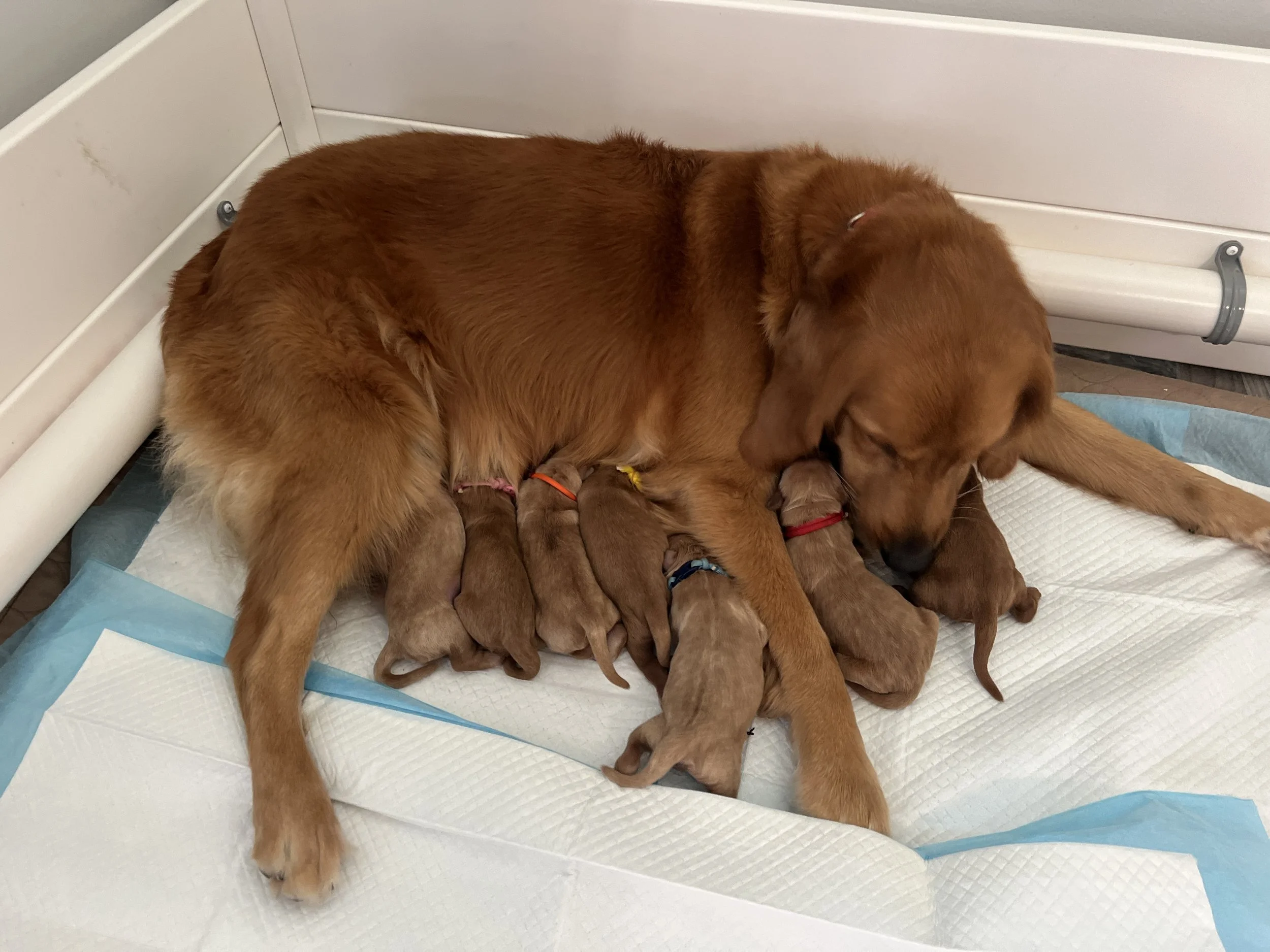 We are excited to announce the delivery of our 5 girls and 3 boys. Molly did a great job, Molly and all 8 beautiful babies are doing great!!