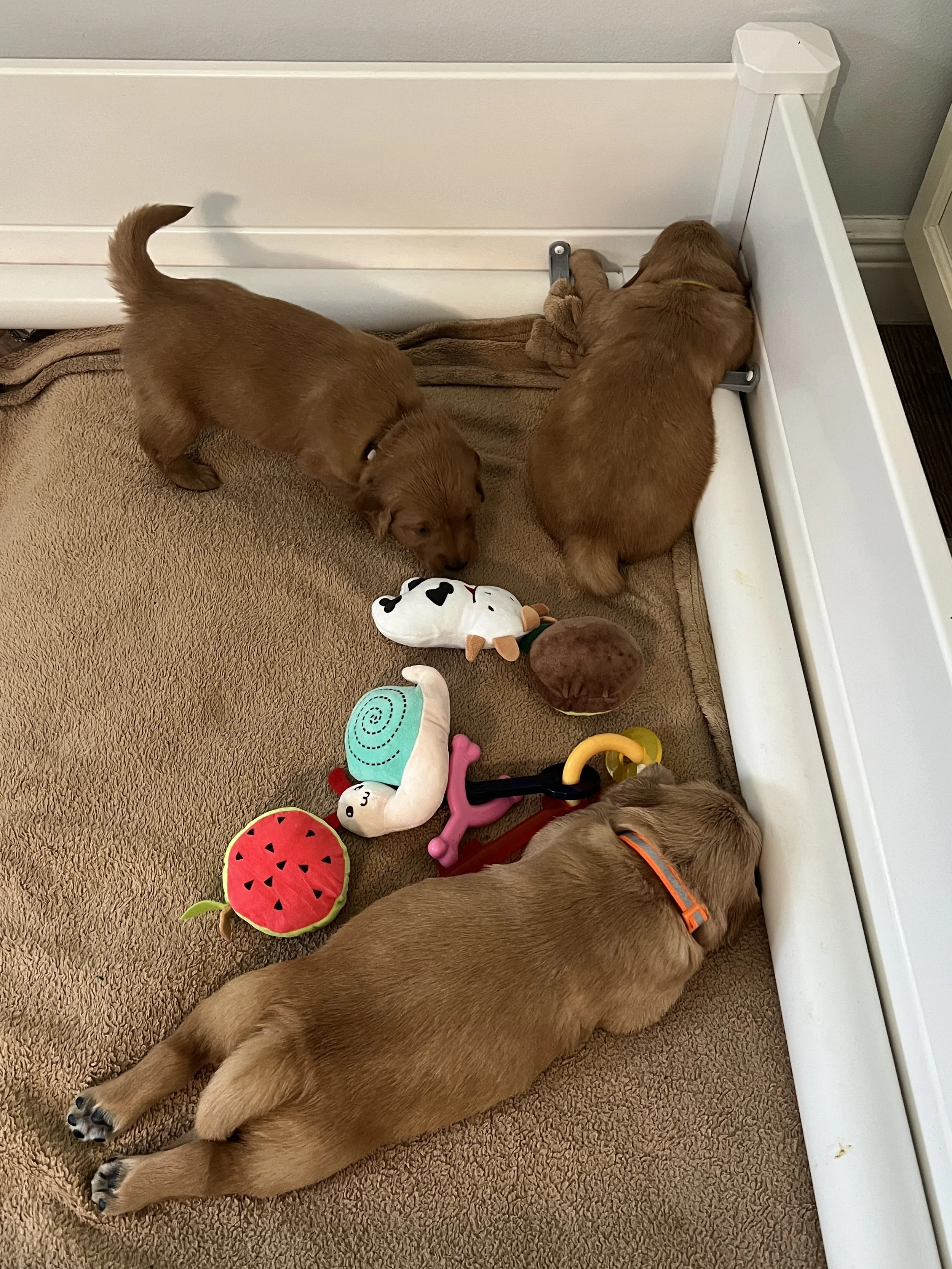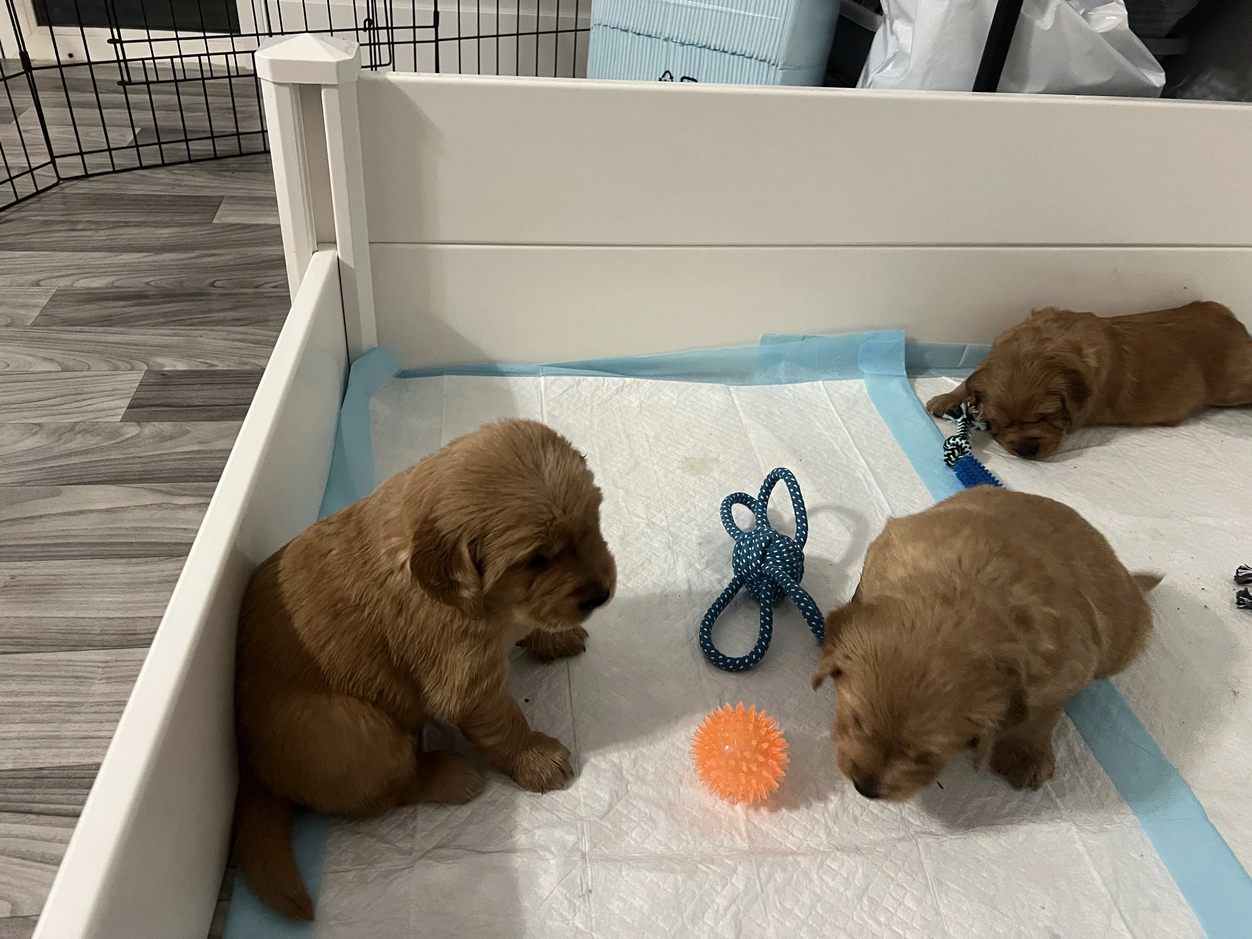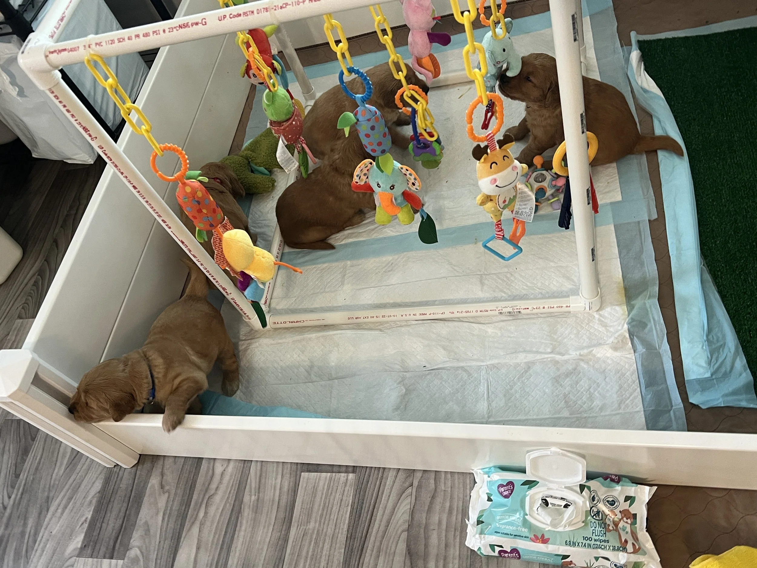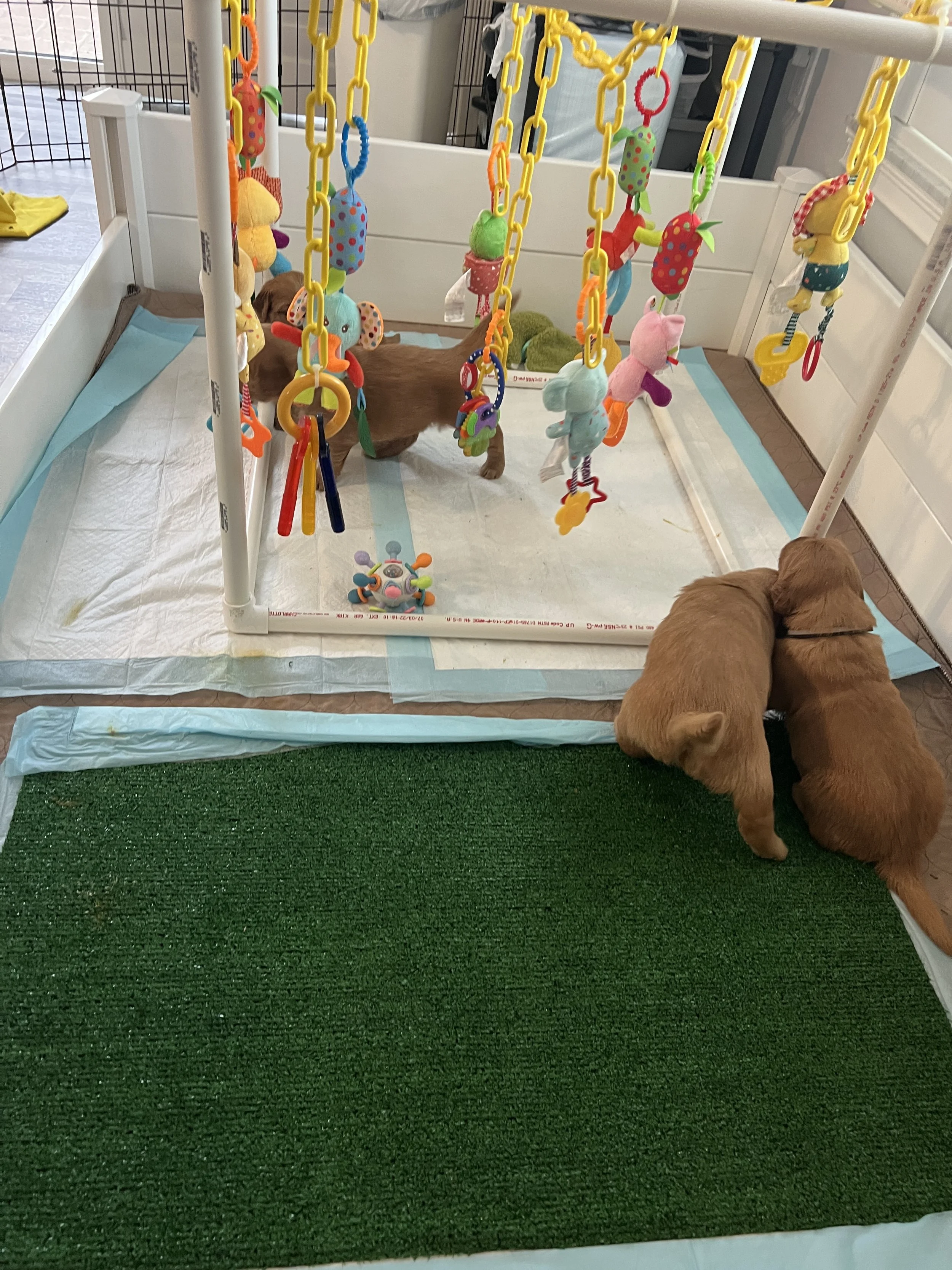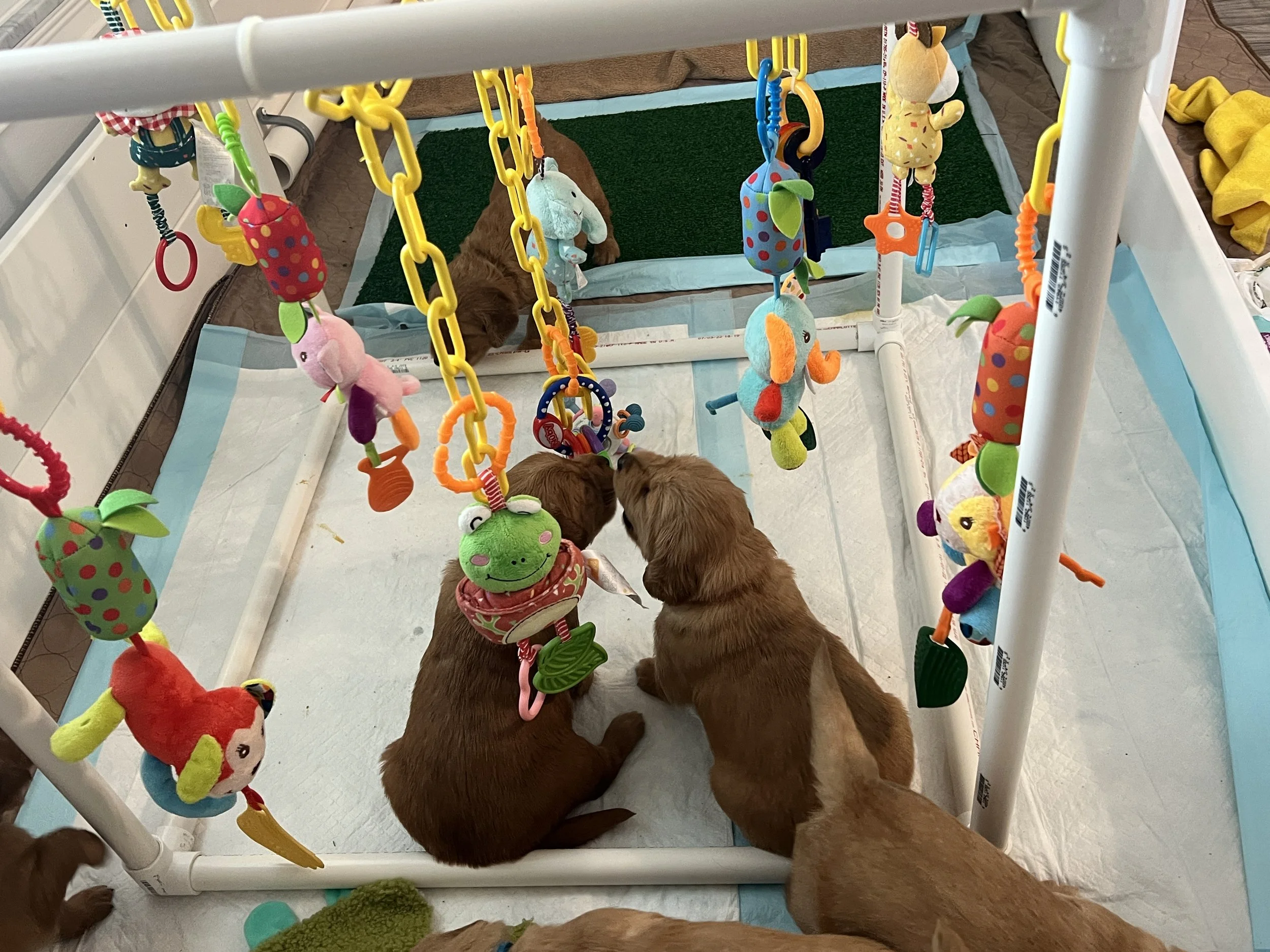 We have added different types of toys for the puppies to play with. Some with squeakers, foil (textile), and chew.